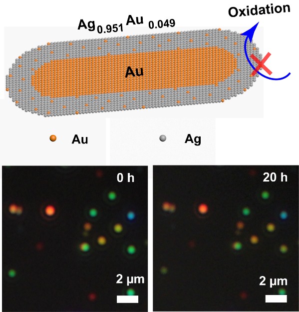 银纳米晶具有优异的等离激元特性,但其不稳定并具有生物毒性。此问题在很大程度上限制了银纳米晶在一般水氧环境中的应用。金银合金化技术可以大幅提升银的稳定性,但在合金中掺杂了过多的金后,会导致银丧失其优越的等离激元特性及共振品质因子的下降。本工作的研究发现,当金掺杂的原子分数低至4.9%时,金银匀质合金即具有与金相当的稳定性,同时银优越的等离激元特性仍得到保留。