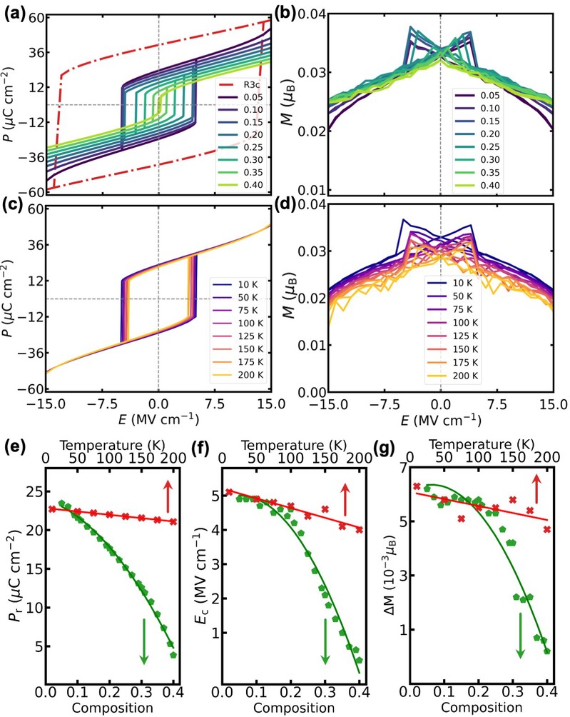 图1: 稀土Nd掺杂和温度对电滞回线和电控磁的影响。(a)P-E电滞回线随Nd组分的变化。