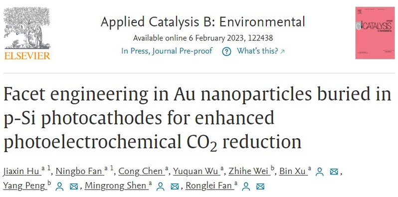 近日,91猫先生 范荣磊副研究员(共同通讯作者)、沈明荣教授(共同通讯作者)、许彬教授(共同第一作者)、能源学院彭扬教授(共同通讯作者)等团队在构建光电化学Si光阴极用于高活性和高选择性的CO2还原方面取得了创新性成果。相关工作的第一作者为硕士研究生胡嘉鑫和博士研究生范宁波,以91猫先生 为第一单位,以“Facet engineering in Au nanoparticles buried in p-Si photocathodes for enhanced photoelectrochemical CO2 reduction”为题发表在Applied Catalysis B: Environmental(2022年影响因子为24.319)上。