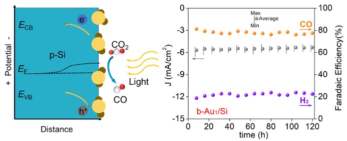 光电化学(PEC)二氧化碳(CO2)还原制备高附加值燃料是存储太阳能和实现碳中和的创新性策略之一,其核心是起CO2还原作用的半导体光阴极。半导体硅(Si),具有接近理想的能带结构、优异的电荷载流子传输性质和较低的制备成本等优势,是一种极具吸引力的光阴极材料。但是,合理地设计Si光阴极以获得高活性和选择性的一氧化碳(CO)等目标产物,仍然是一个巨大挑战。