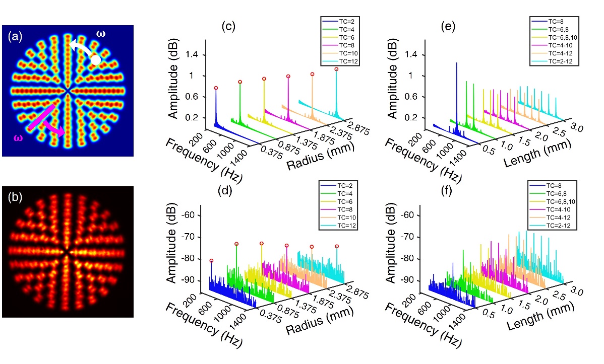 研究团队通过理论和实验验证了该光束在感知旋转物体中的应用,包括旋转半径和空间尺寸的感知。由于超密集的空间分布,物体的速度和旋转轴也可以被检测到。此外,通过调制每个环的拓扑荷,可以生成频率梳,从而实现对旋转目标的更多信息获取。通过实验验证了超密集矢量完美涡旋光束的生成及其在旋转多普勒效应中的应用。实验结果表明,交叉偏振叠加显著减少了环间的干扰,使得在有限区域内嵌套多个完美涡旋环成为可能。实验中,在3毫米的外半径内生成了12个束腰为0.2毫米的环,且通过模拟展示了在束腰为0.05毫米时,最多可生成43个可区分的环。研究团队还展示了该光束在旋转物体感知中的应用,包括旋转半径和物体尺寸的测量。通过调制拓扑荷,生成了频率梳,并利用其解决了旋转轴未对准的问题。