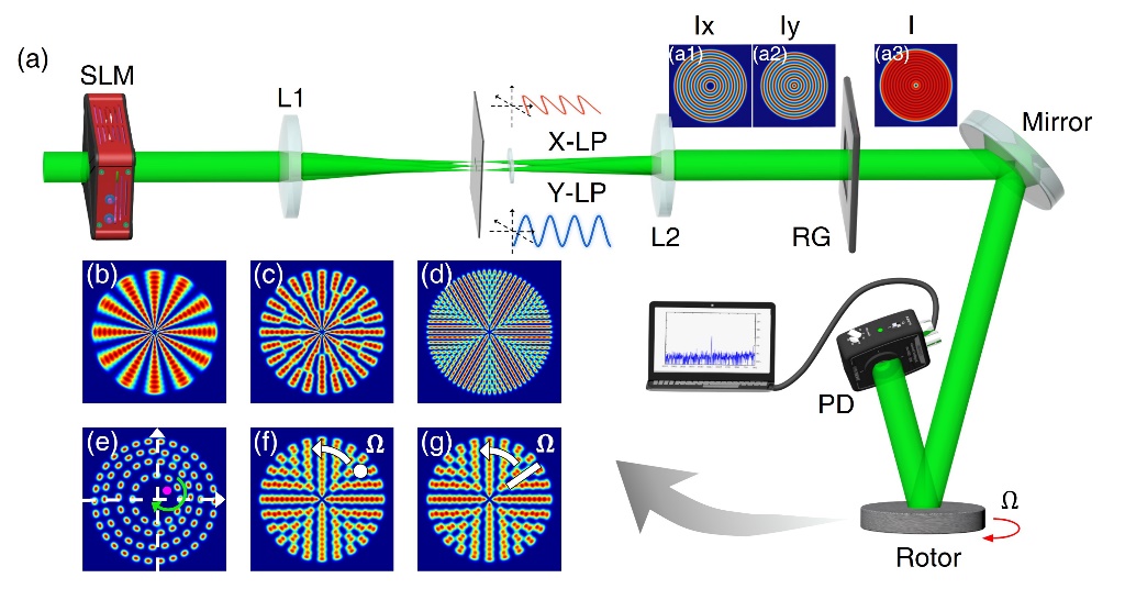 图1.超密集矢量完美涡旋光束的生成示意图及旋转多普勒频移测量实验装置。