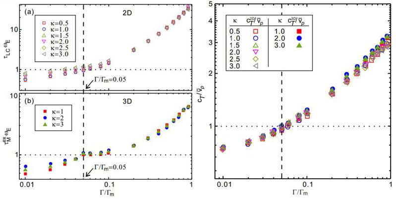 在传统超临界流体研究中,一般通过Frenkel线表征系统的类气-液转变,即系统的弛豫时间等于单颗粒的振动周期。研究发现,二维尘埃等离子体的系统弛豫时间可以用系统平均拓扑结构改变时间tau_LC来描述,而三维系统则可用去掉动能项后的黏弹性弛豫时间tau_M^{ex}描述,单颗粒振动周期则可用爱因斯坦频率的倒数统一表示,由此得出这两对时间比随系统相对耦合参数的变化均满足标度律,如图左所示。根据系统弛豫时间等于单颗粒的振动周期定义的Frenkel线,也位于系统的二十倍熔点处,与系统输运系数转变对应的条件一致。